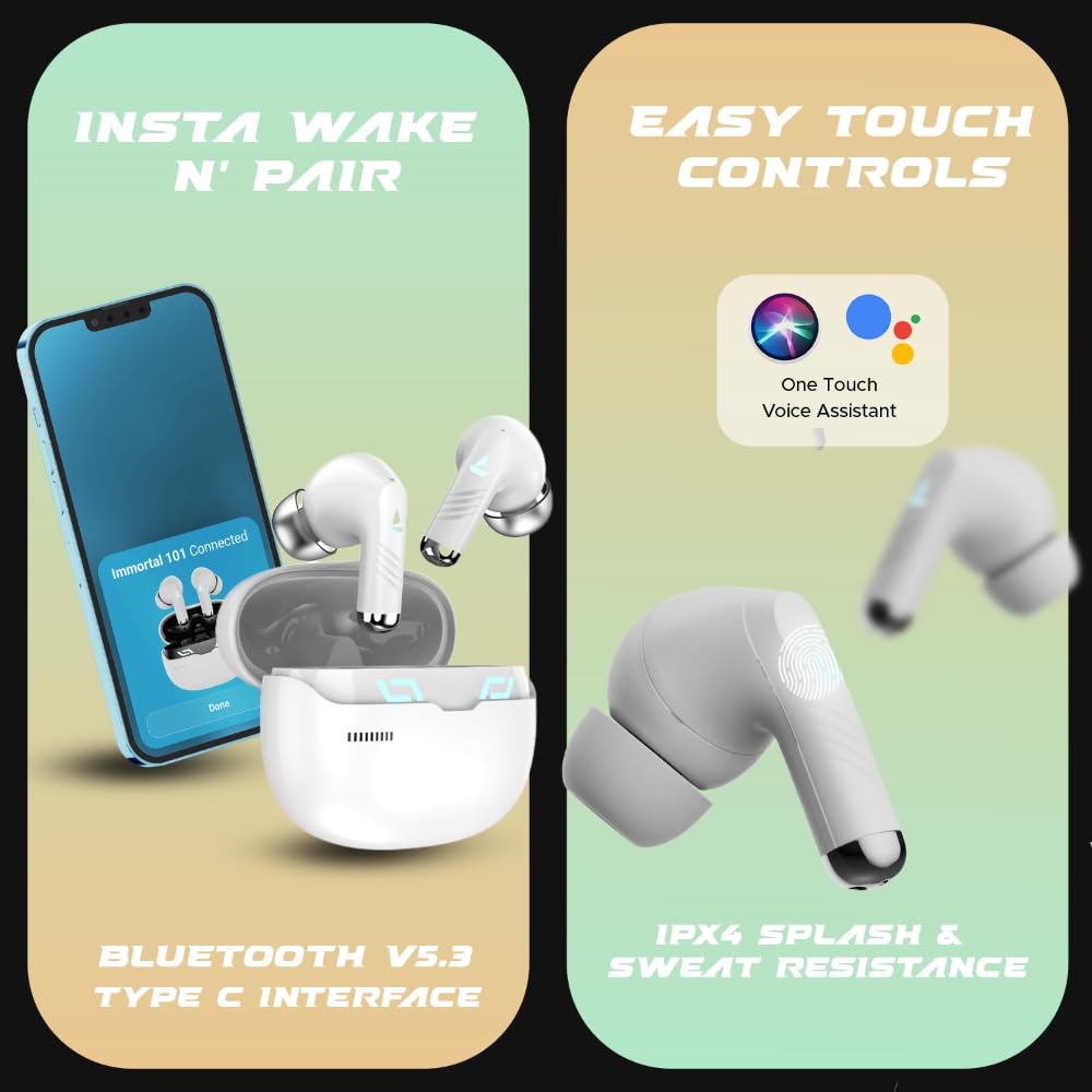 Claim the top position on the leaderboard with the boAt Immortal 101 TWS Gaming Earbuds. Its 40 ms super low-latency BEASTTM mode matches virtual action with high-octane sound for top-notch gaming. Moreover, about 30 hours of power-packed playtime lets you enjoy your gaming spree without interruptions. Race through numerous levels with ease while defeating your opponents in style. Breathing RGB LED lights on both earbuds relay your vibe with rhythmic transitions exuding a pro-gamer appeal. You can revel in listening to your favorite content in balanced boAt Signature Sound for a superior experience. By warding off unwanted background noise, ENxTM technology in the quad mics lets you complete important calls even if you are on the move. Speak to your heart’s content with high clarity and if you’re running low on charge, boAt’s ASAPTM Charge function extends the talk time by up to 100 minutes with just 10 minutes of charging. You can also finish intense workouts daily as these earbuds are shielded against sweat and water splashes with IPX4 resistance. Stream and game seamlessly with Immortal 101!