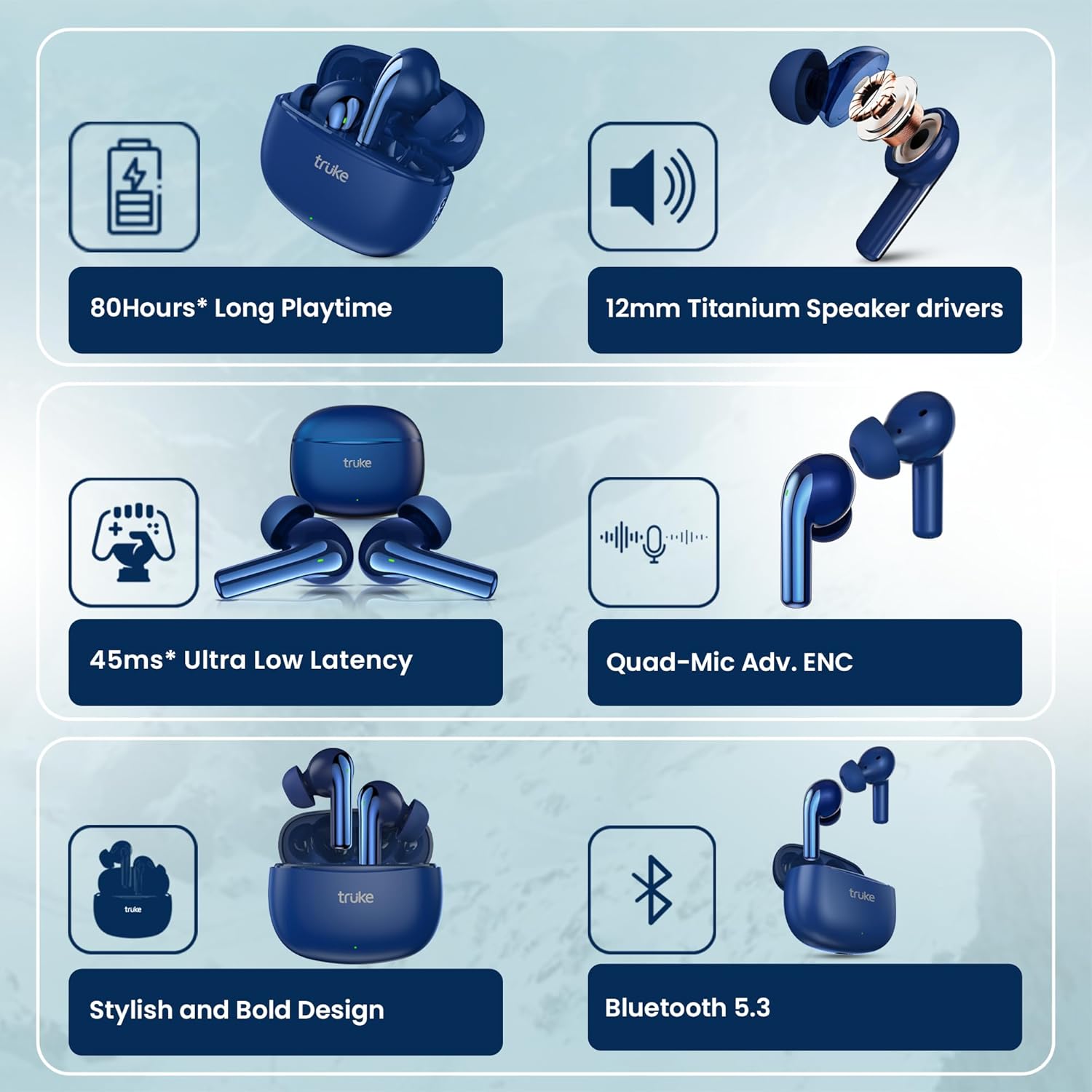 | Special Features | Quad-Mic Advanced Environmental Noise Cancellation(ENC) providing crystal-clear calls, 45ms* Ultra Low Latency Gaming mode, 12mm Titanium drives, 80H* Playtime with Fast Charging, Bluetooth 5.3, Touch Controls, IPX5 Sweat & Water Resistant |